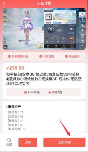 在账号列表中选择目标游戏账号,查看详细等级、装备等完整资料,确认购买后点击立即购买按钮,即可完成交易并获取账号信息。