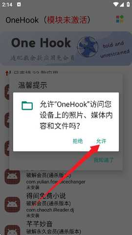下载安装OneHook软件,并打开。进入首页后,根据提示授予必要的权限,以确保软件能够正常运行。