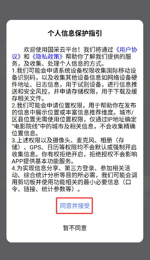 首次启动软件时,需阅读并同意用户协议,点击同意后进入主界面。