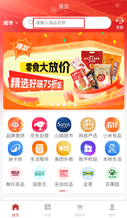在首页顶部的搜索框中输入商品关键词,快速查找所需物品。