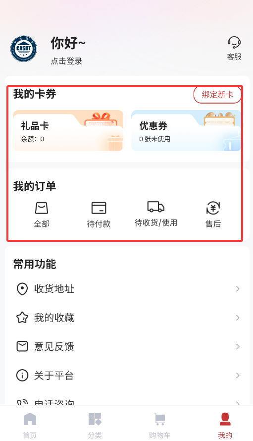 个人中心则提供卡券管理功能,方便查看礼品卡、优惠券及历史订单。