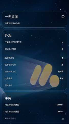 设置选项,在任意空白位置长按进入设置页面,调整启动器的默认设置,满足个性需求。