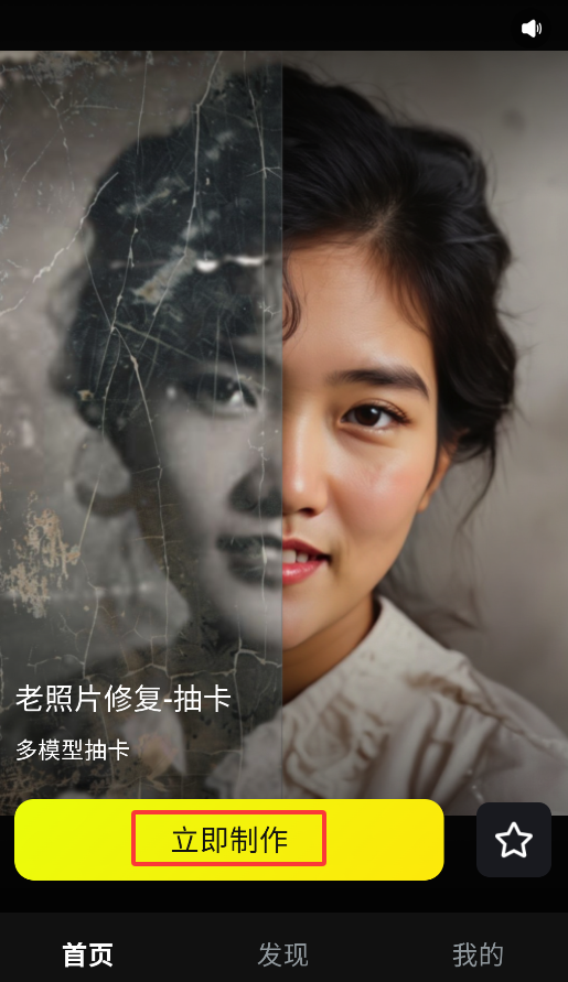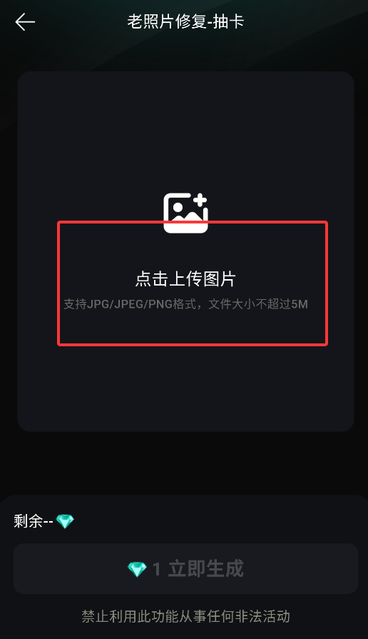在修复编辑页面,选择需要处理的旧照片进行上传,点击生成按钮即可自动完成修复。