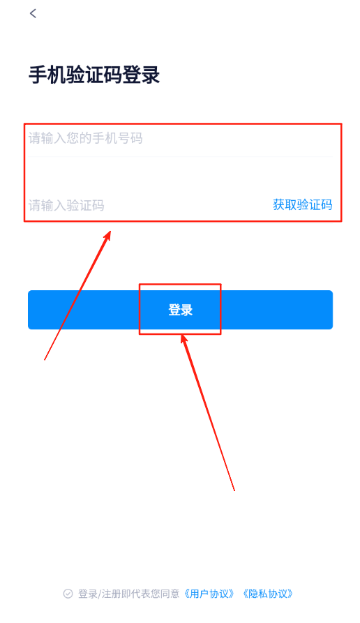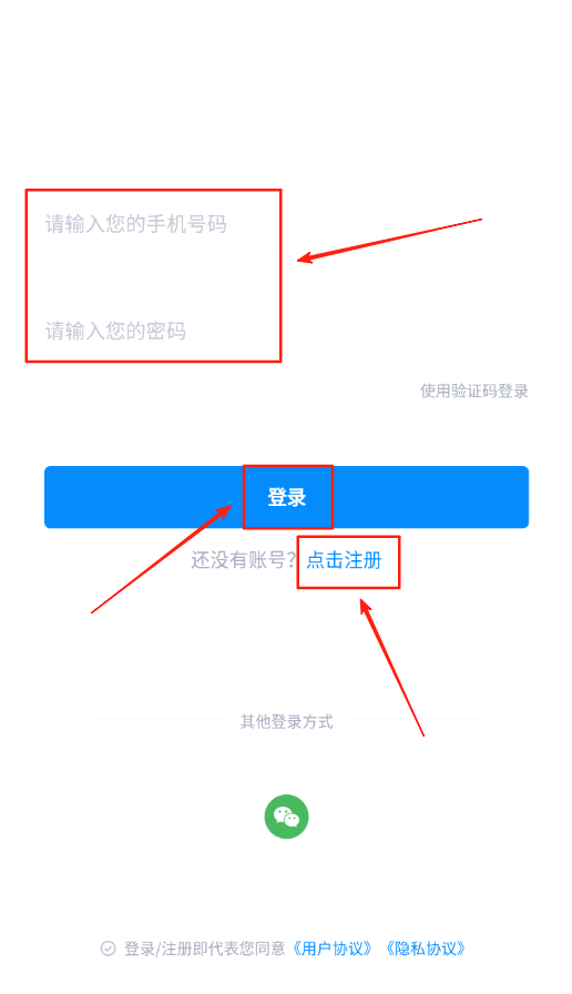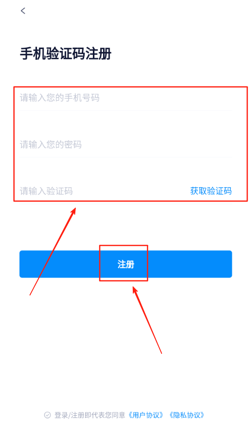 新用户注册时,需先输入手机号获取验证码,填好验证码后设置密码,完成注册流程即可。
