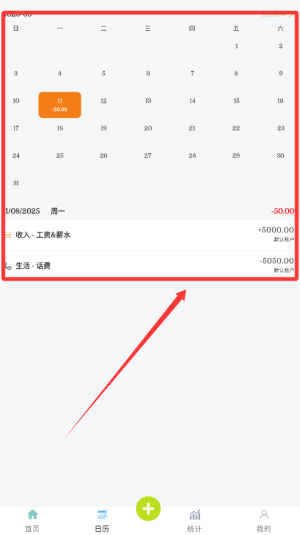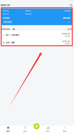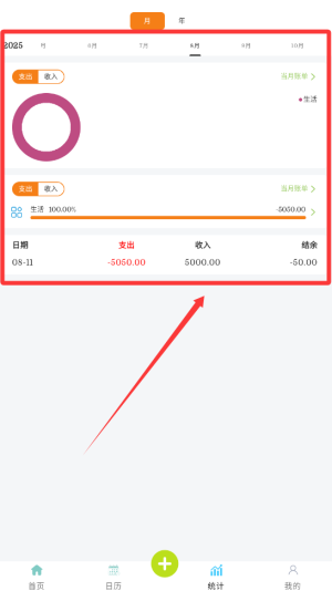 若需查看统计数据,返回主界面,点击统计选项,系统将自动生成可视化图表,帮助分析消费情况。