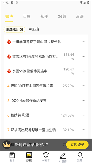 接下来进入热搜功能,可以浏览微博、百度、知乎等热门话题,获取灵感,丰富直播内容。