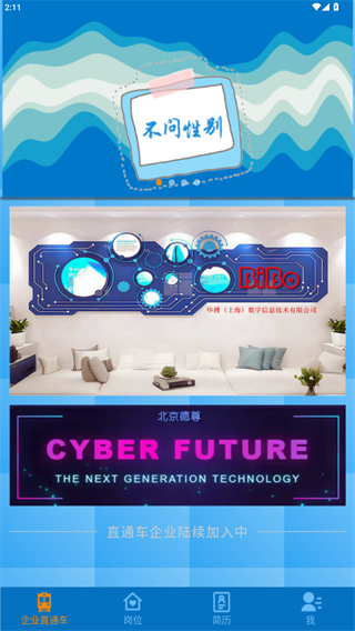 在首页,可以查看企业直通车,浏览不同企业的信息,获取最新的招聘动态。