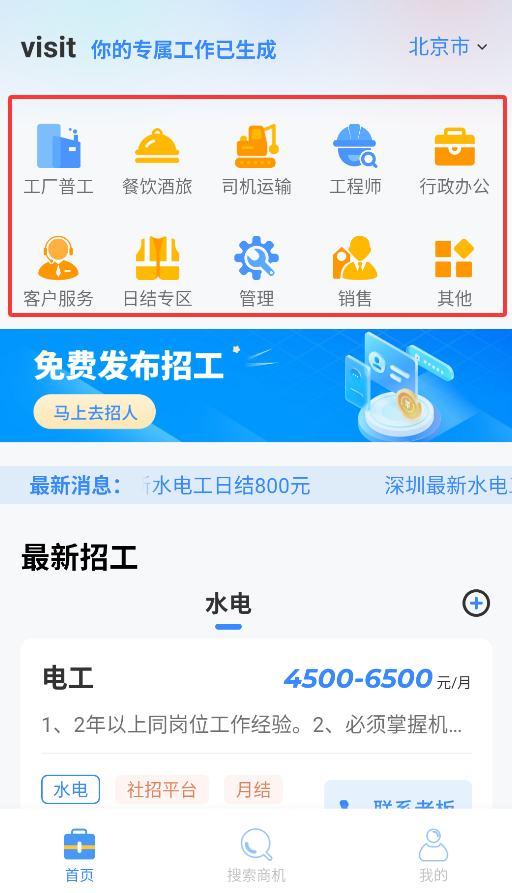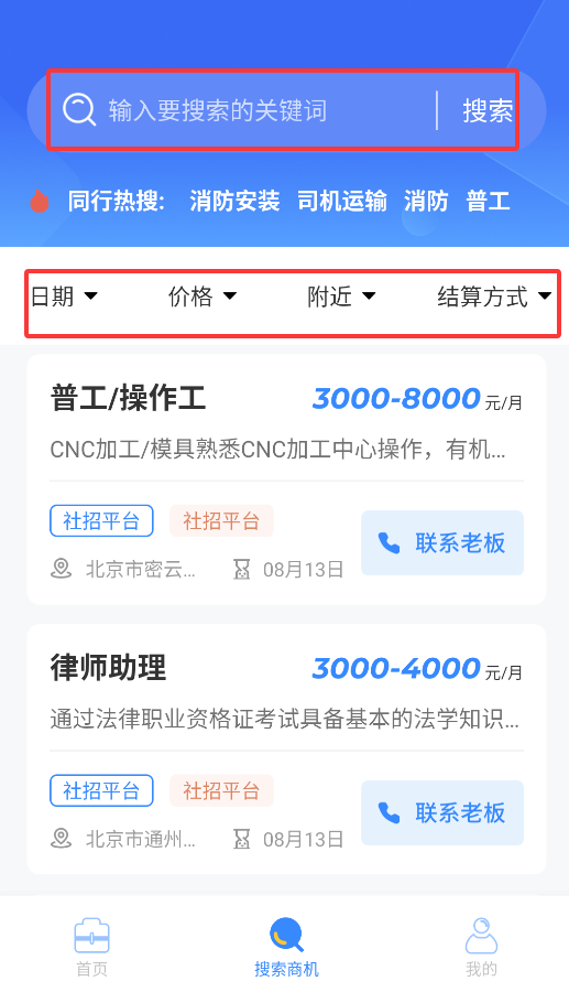 选择合适的行业后,可通过商机搜索功能支持关键词查询,按日期、薪资范围、距离及结算方式等条件精准筛选。