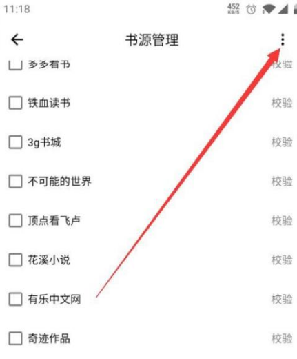 添加书源:在书源设置界面,点击右上角的“更多”按钮(可能显示为三个点或类似的图标)。