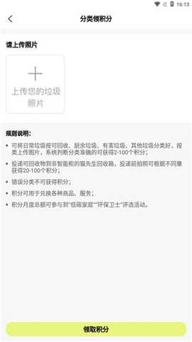 接下来,选择垃圾回收功能,按照指引上传垃圾照片,系统会自动识别分类并给予积分。