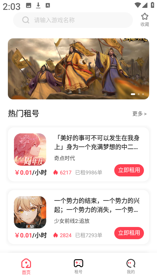 4、任意选择一款感兴趣的游戏账号,直接点击“立即租用”即可。