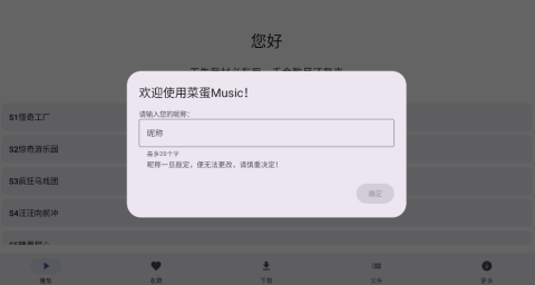输入您的昵称以创建个人账户,完成后即可开始浏览音乐库,选择您想要收听的曲目。