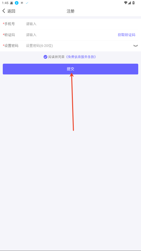 输入手机号码并获取验证码。设置好密码后,点击提交即可完成注册。