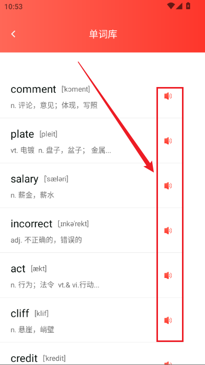 点击“词库”,可查看常见词汇,点击词汇后方的喇叭图标,就能跟着读音进行学习。