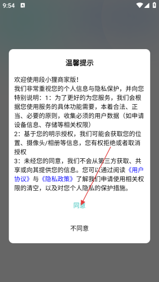 首次使用时,需先阅读用户协议和隐私政策,点击【同意】接受条款。