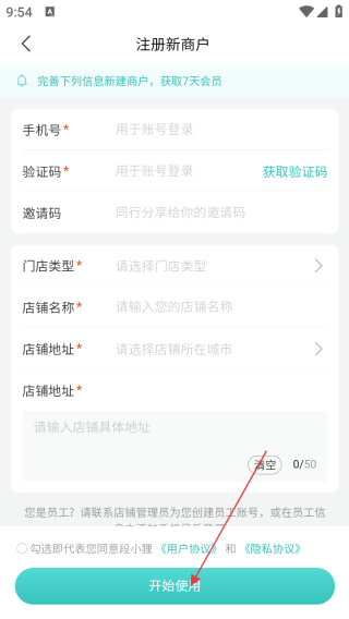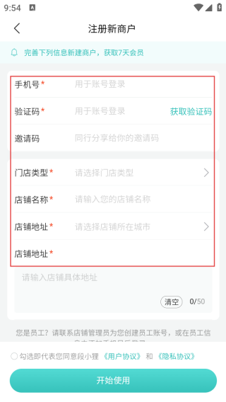 填写相关注册信息,确保必填内容完整准确,勾选同意协议后,点击【开始使用】完成新商户注册,进入系统使用。