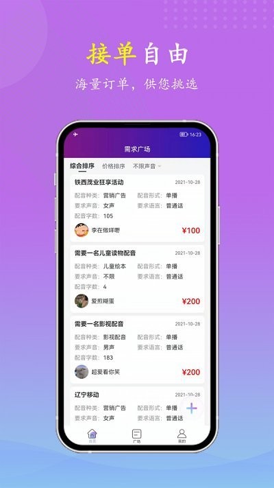 订单发布功能:一键发布配音需求,快速获取配音服务,节省时间。