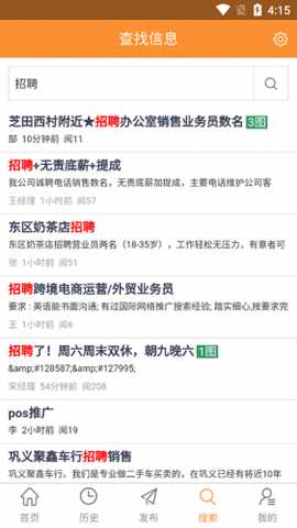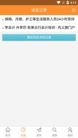 1、在本站下载安装巩义搜app,可以看到底部有首页、历史、发布、搜索、我的五个板块。
