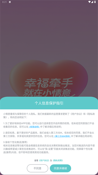 查看信息保护指引,仔细阅读使用协议和隐私政策等内容,确认同意后继续。