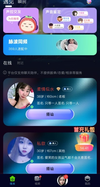 系统会根据你的兴趣和性格自动推荐合适的聊天伙伴,用户还可以通过在线状态查看附近的异性好友,随时发起聊天。