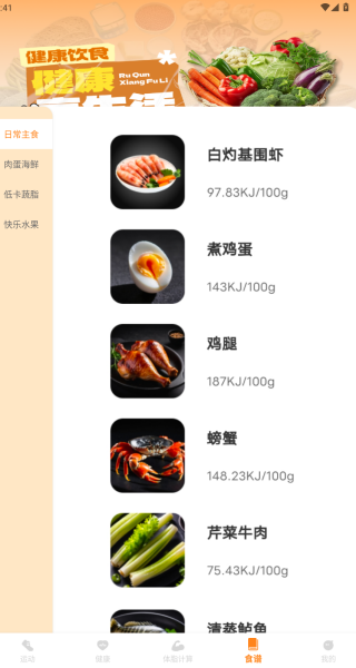 健康食谱参照表为用户提供饮食计划的建议,帮助更好地管理饮食与运动的搭配。
