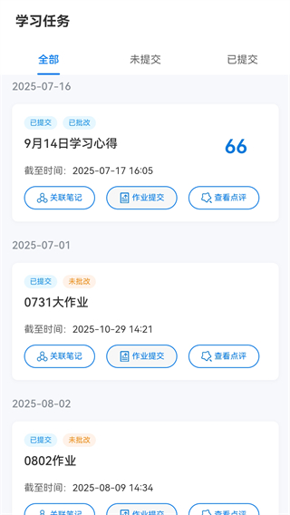 学习任务模块可将笔记与任务关联,学员可以随时查看任务完成情况,老师点评后能及时获取反馈。