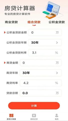 在本站下载云顶房贷计算器助手后,打开软件,您将看到简洁的主界面。选择您需要的贷款类型,商业贷款或公积金贷款。
