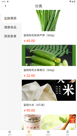 在全部商品中,使用搜索功能查找健康有机商品,点击商品进入详情页,了解更多信息。