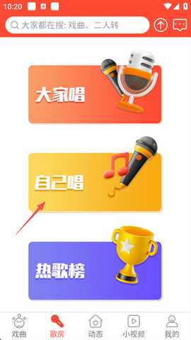 2、根据情况自行选择“歌房”类型,以“个人歌房”为例,点击屏幕中的“自己唱”。