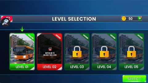 8. 在关卡选择 (LEVEL SELECTION) 界面,初始解锁关卡1 (LEVEL 01)。后续关卡可以通过观看广告或完成前序关卡解锁。选择关卡后点击“SELECT”进入。