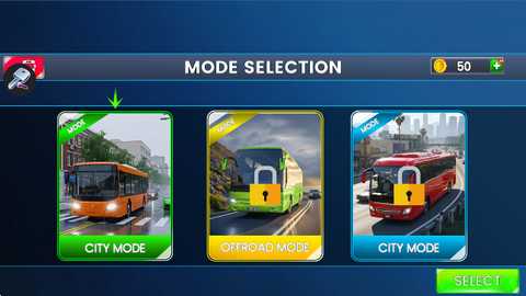 7. 在游戏模式选择 (MODE SELECTION) 界面,你可以选择城市模式 (CITY MODE)、越野模式 (OFFROAD MODE) 等。选择后点击“SELECT”进入。