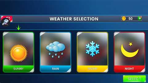 6. 在天气选择 (WEATHER SELECTION) 界面,你可以选择晴天 (SUNNY)、雨天 (RAIN)、雪天 (SNOW)、夜晚 (NIGHT) 等天气。选择后点击“SELECT”确认。