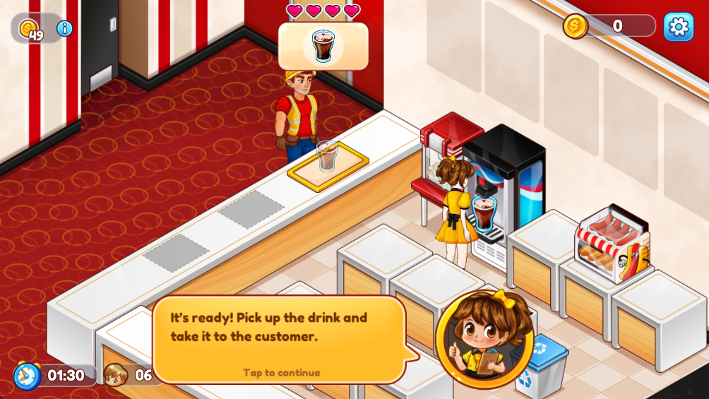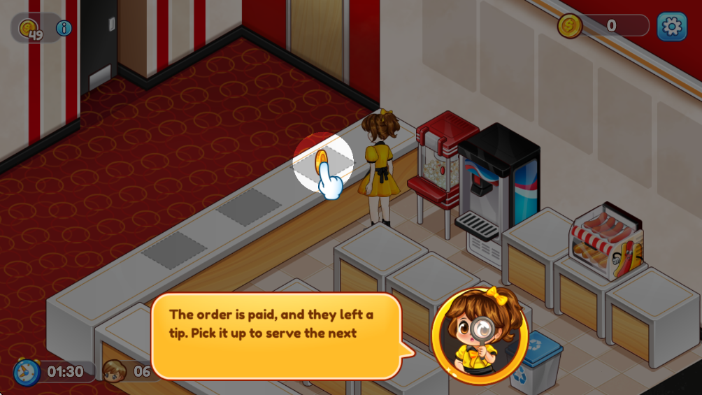 可以点击收集顾客支付的金币,这些收入可用于后续的设施升级或新设备购买,逐步扩大经营规模并解锁更多游戏内容。