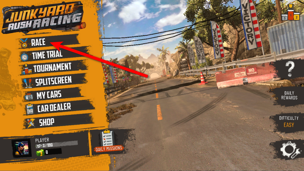 1.进入游戏之后点击RACE开始比赛。