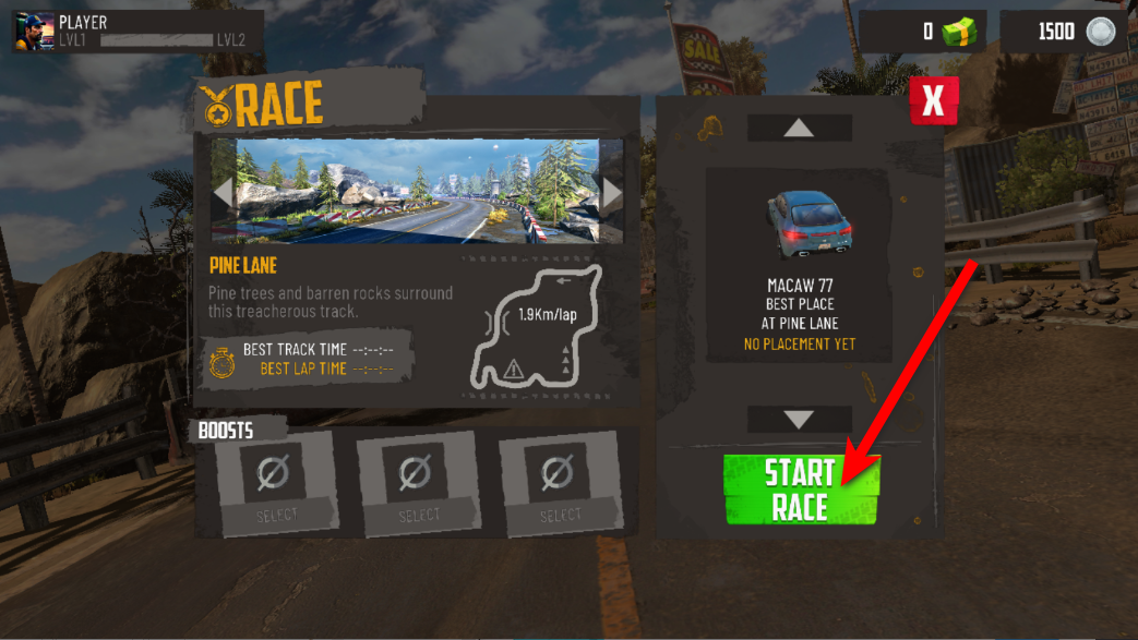 2.选择一个地图和赛车,准备好了之后点击START RACE进入。