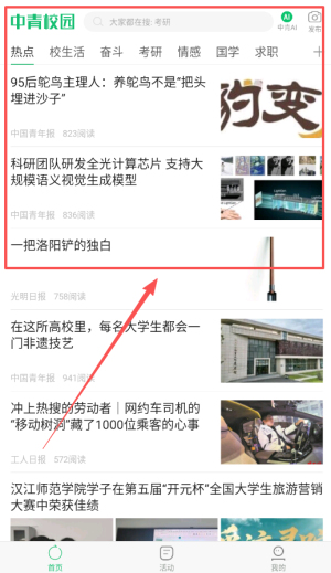 1、启动中青校园App后,首页汇聚了丰富的新闻资讯与校园活动,可以迅速定位自己感兴趣的内容,节省浏览时间。