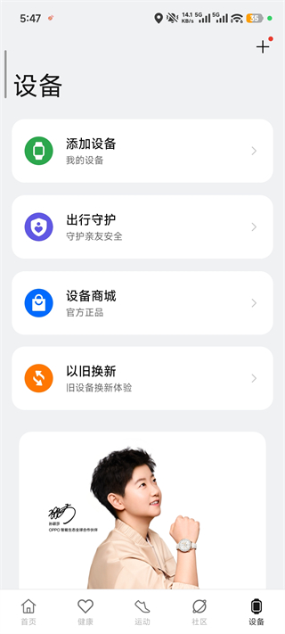 提供添加设备、出行守护、设备商城、以旧换新等服务。