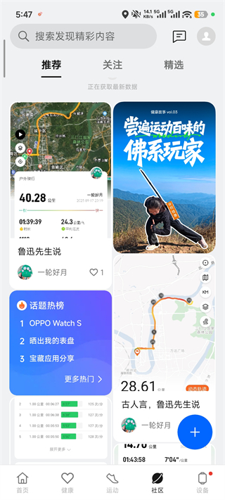 有推荐、关注、精选内容,可浏览运动轨迹分享、健康故事及话题热榜。