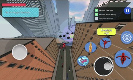 需要熟悉角色的基本操作,包括如何使用蛛网进行移动。通过瞄准目标并点击发射,可以迅速在城市中穿梭,感受飞翔的快感。