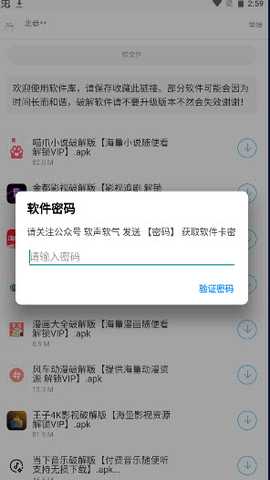 在本站下载尘墨软件库软件后,打开软件并进入主页,用户会看到一个弹窗提示;根据提示关注公众号,发送【密码】以获取软件卡密。