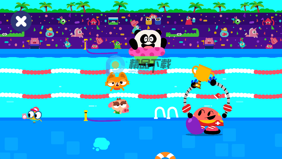 在课程中,选择一个喜欢的角色,开始参与各种有趣的活动,游泳比赛,通过回答问题来获得更快的游泳速度。