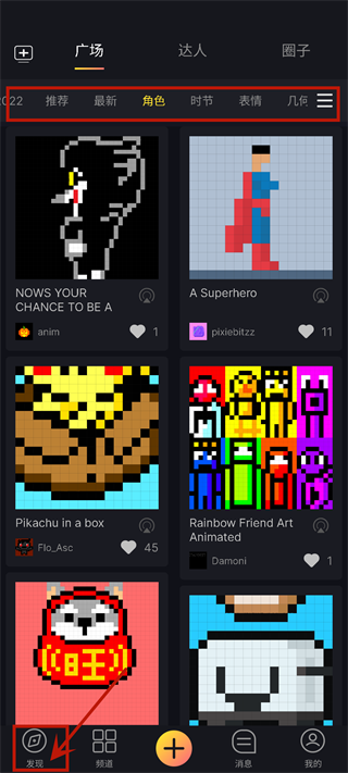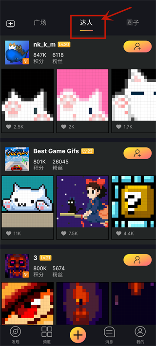 2、进入应用后,点击中间方块按钮可以浏览广场上的各种动态,查看其他用户的创作作品。