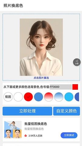 多样底色选择:提供多种标准证件照底色,如红、白、蓝等,用户还可以选择自定义颜色,适应不同场合的需求。