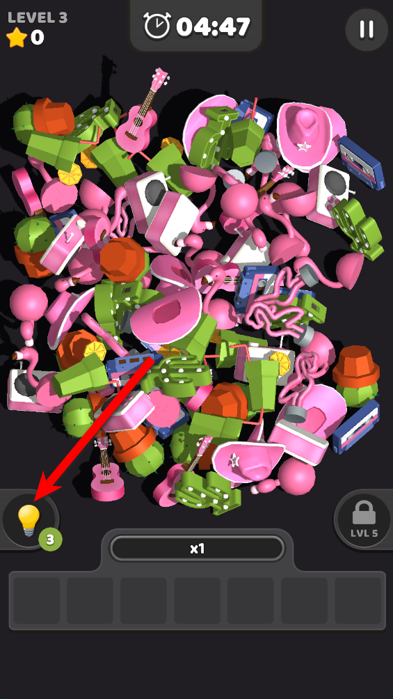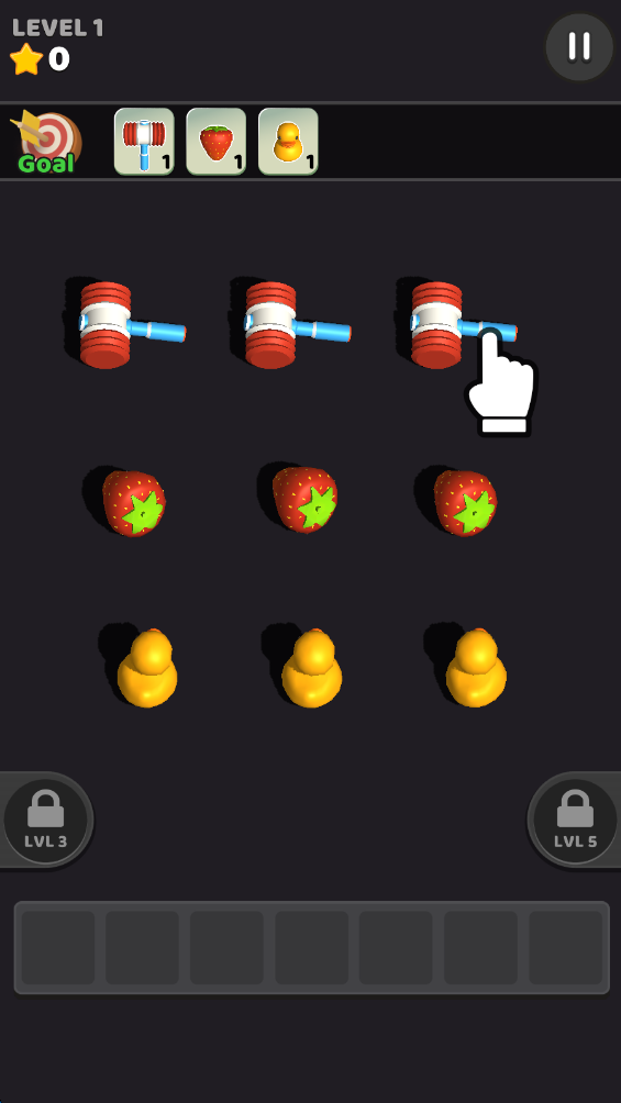 2.点击上方相同的物品移动到下方,如果有三个相同的物品即可进行消除。