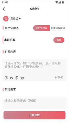 选择所需的写作类型,小说或论文,输入关键词或简要描述,系统将自动生成初始草稿。