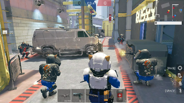 3.进入战斗场景,玩家需操控猫咪特警在类似城市巷道的地中移动、射击,利用场景中的车辆、建筑等作为掩护,与敌人展开对战。