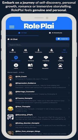 在本站下载并安装RolePlai后,打开软件进入AIChat(AI聊天)模块,浏览Popular(热门)、Trending(趋势)、NewBots(新角色)或Categories(分类)等选项,寻找感兴趣的角色。