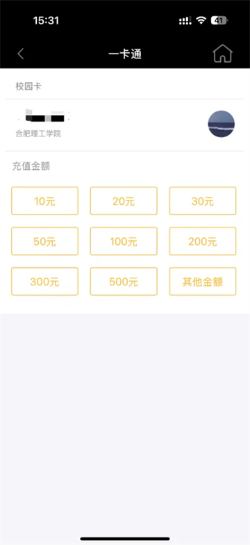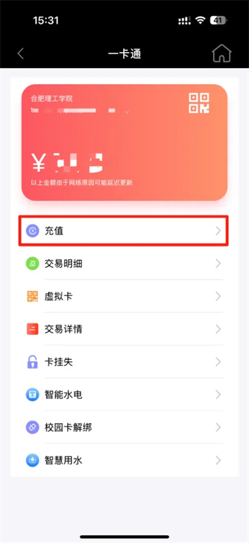 在首页找到一卡通模块,点击充值按钮,选择或输入金额,选择支付方式后确认付款即可完成充值。