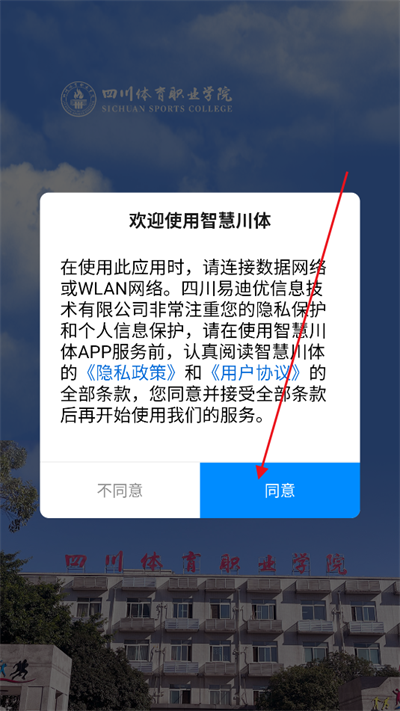 在本站下载智慧川体后,首先需要点击同意使用条款,输入工号或学号,输入密码即可完成登录。