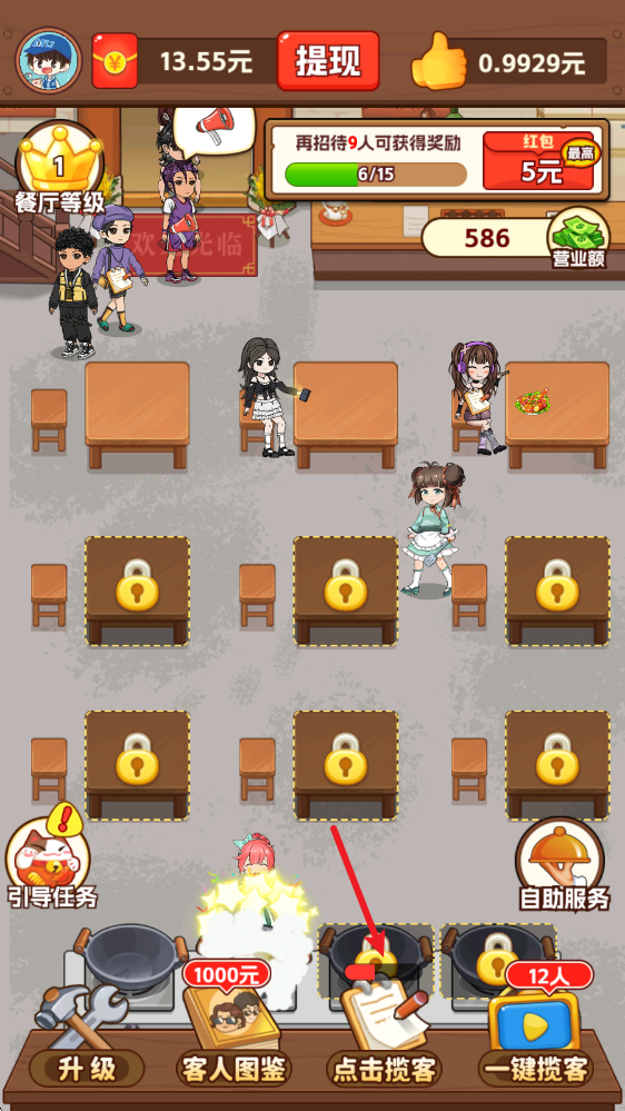 进入游戏后,可以通过点击右下角的揽客按钮,吸引顾客前来用餐。